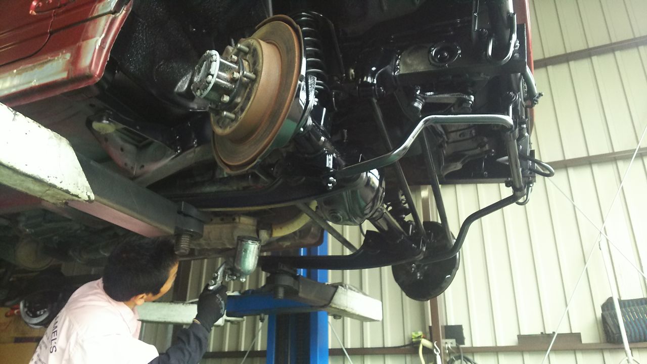 下回りを高圧洗浄機でキレイにしてからシャーシブラック吹いていきます。
